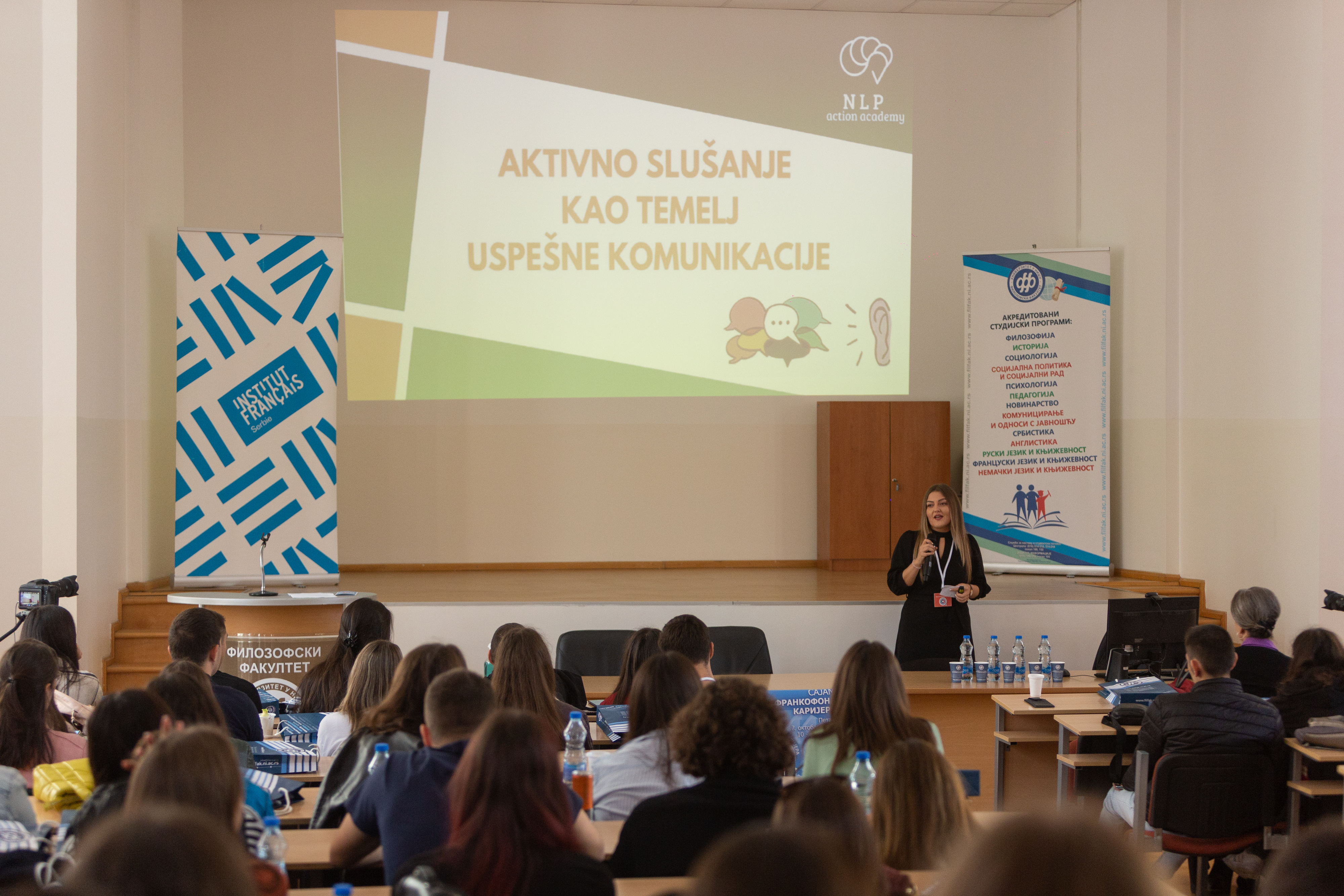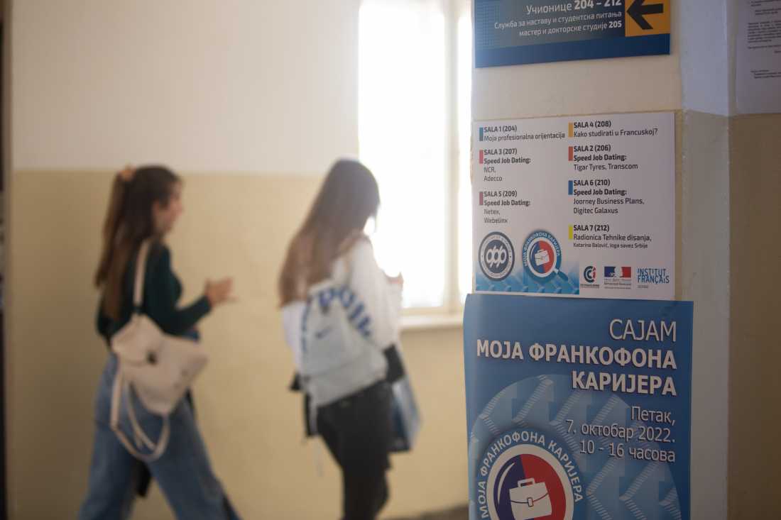 Филозофски факултет је у сарадњи са Француским институтом и Француско-српском привредном комором у петак, 7. октобра 2022. године, на велику радост и задовољство, угостио три стотине ученика двојезичних, француско-српских одељења и студената француског језика и књижевности из Београда, Новог Сада, Пирота, Крагујевца, Ваљева и Ниша. Кроз радионице Kако се ослободити треме за разговор за посао или јавни наступ, Kако пронаћи посао, Kако припремити биографију и мотивационо писмо и Важност soft skills-а и како их стећи посетиоци су могли да употпуне своја знања како би постали квалитетнији кандидати на тржишту рада. А потом су кроз разговор са компанијама различитих делатности: NCR, Tigar Tyres, Joorney Buisness Plans, Adecco, Transcom, Webelinx, Digitec Galaxus AG и Netex сазнали које им могућности за рад додатно отвара познавање француског језика. Заинтересовани за књижевно превођење и приватно предузетништво у области наставе језика имали су прилику да се упознају са професионалцима у овом домену.