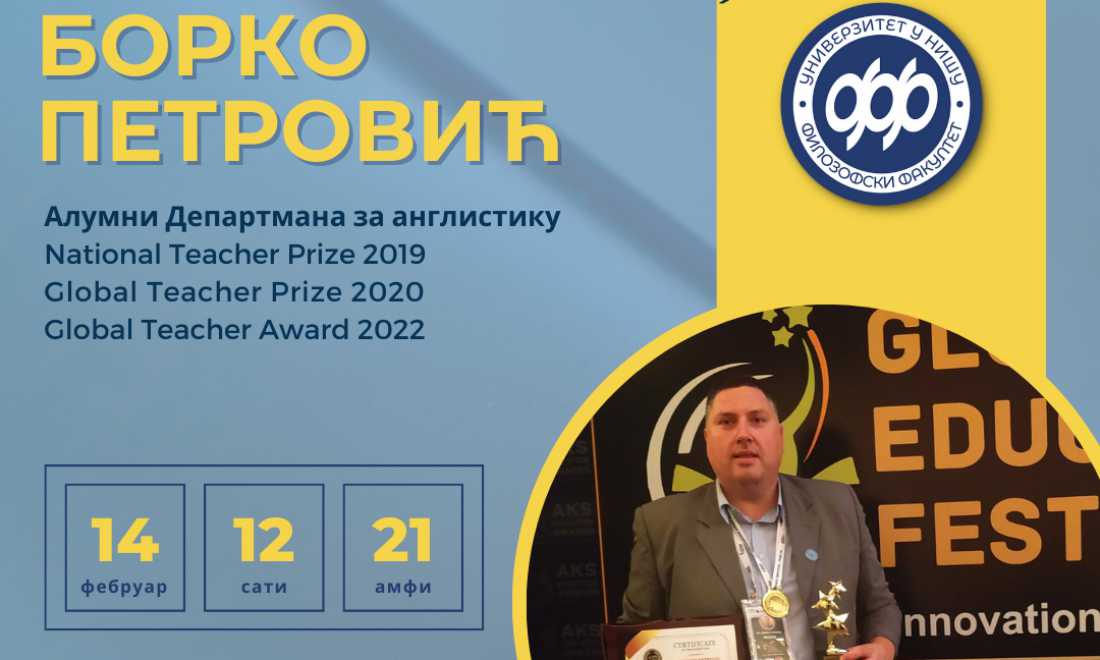 Задовољство нам је да најавимо да ће Борко Петровић, који је на прошлогодишњим Global Teacher Awards у Њу Делхију проглашен за најбољег наставника на свету, бити гост Филозофског факултета у Нишу.