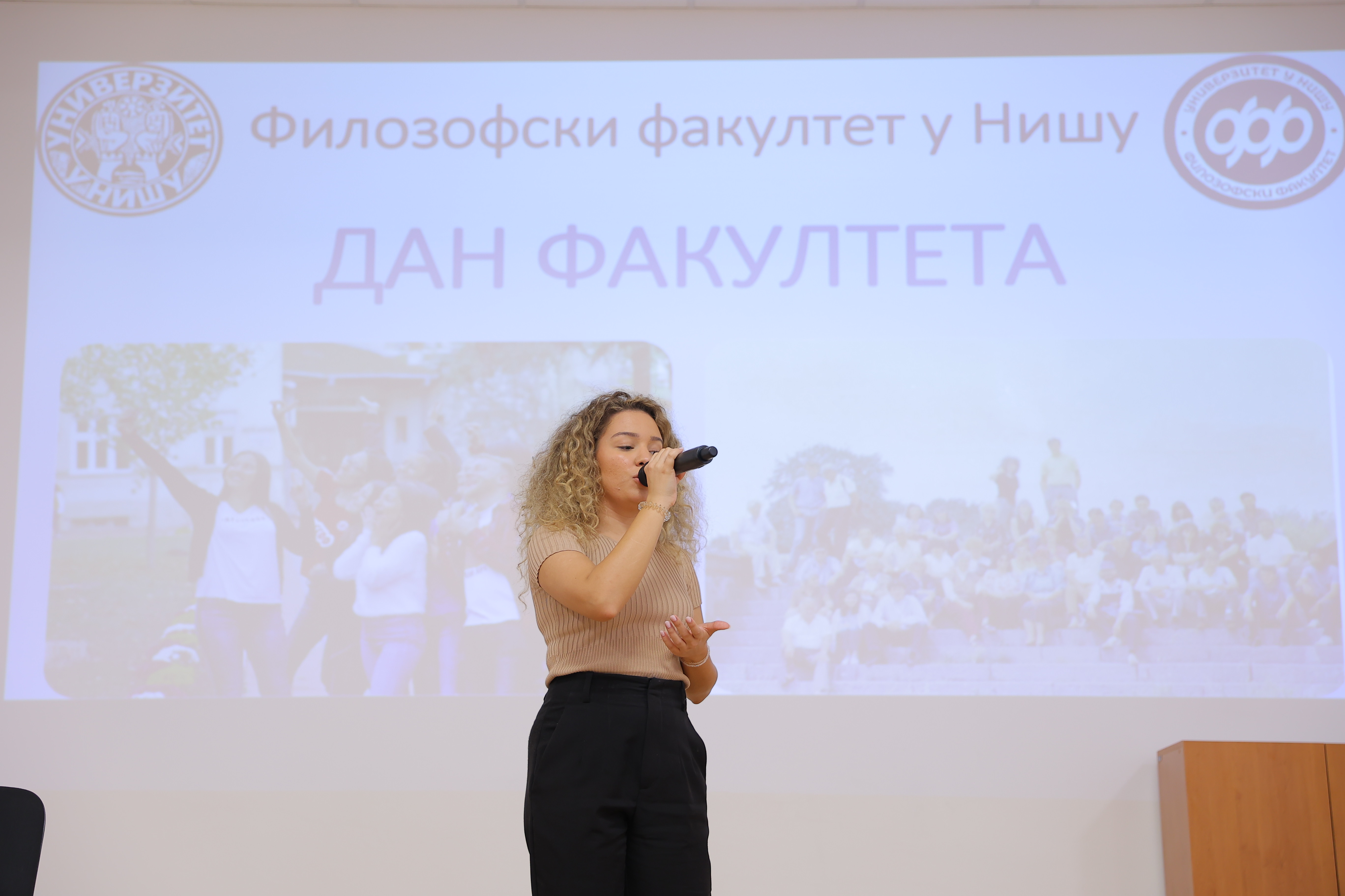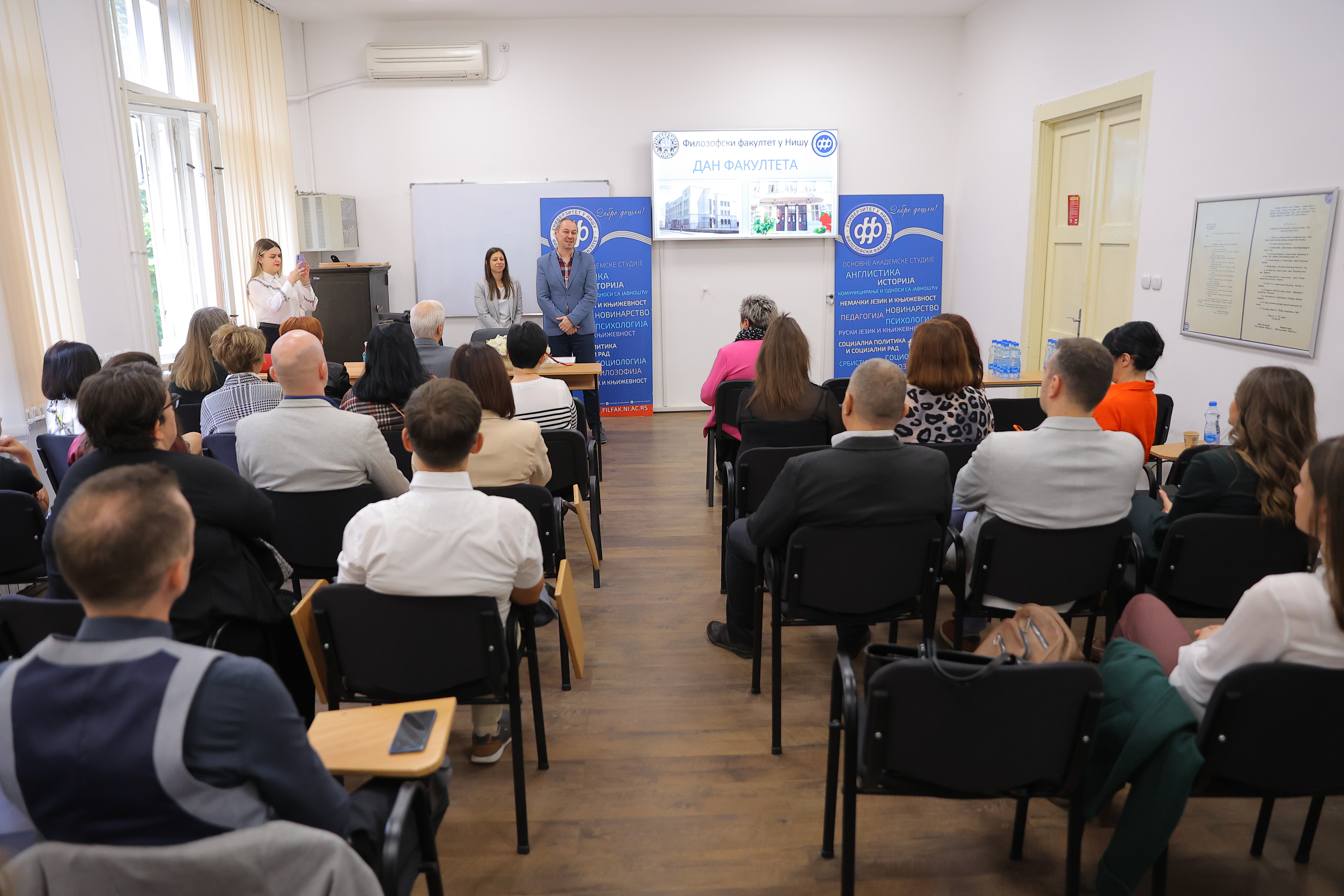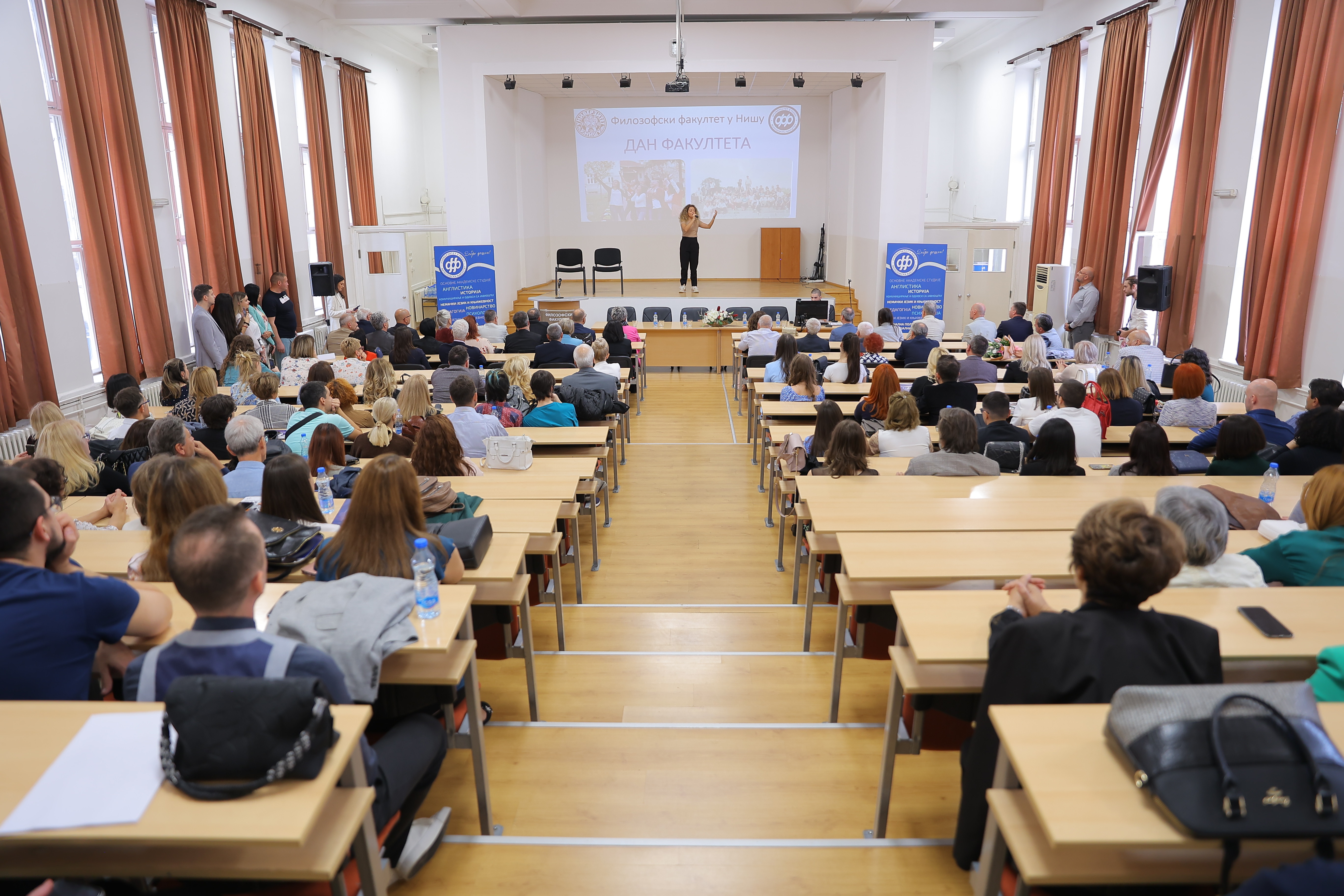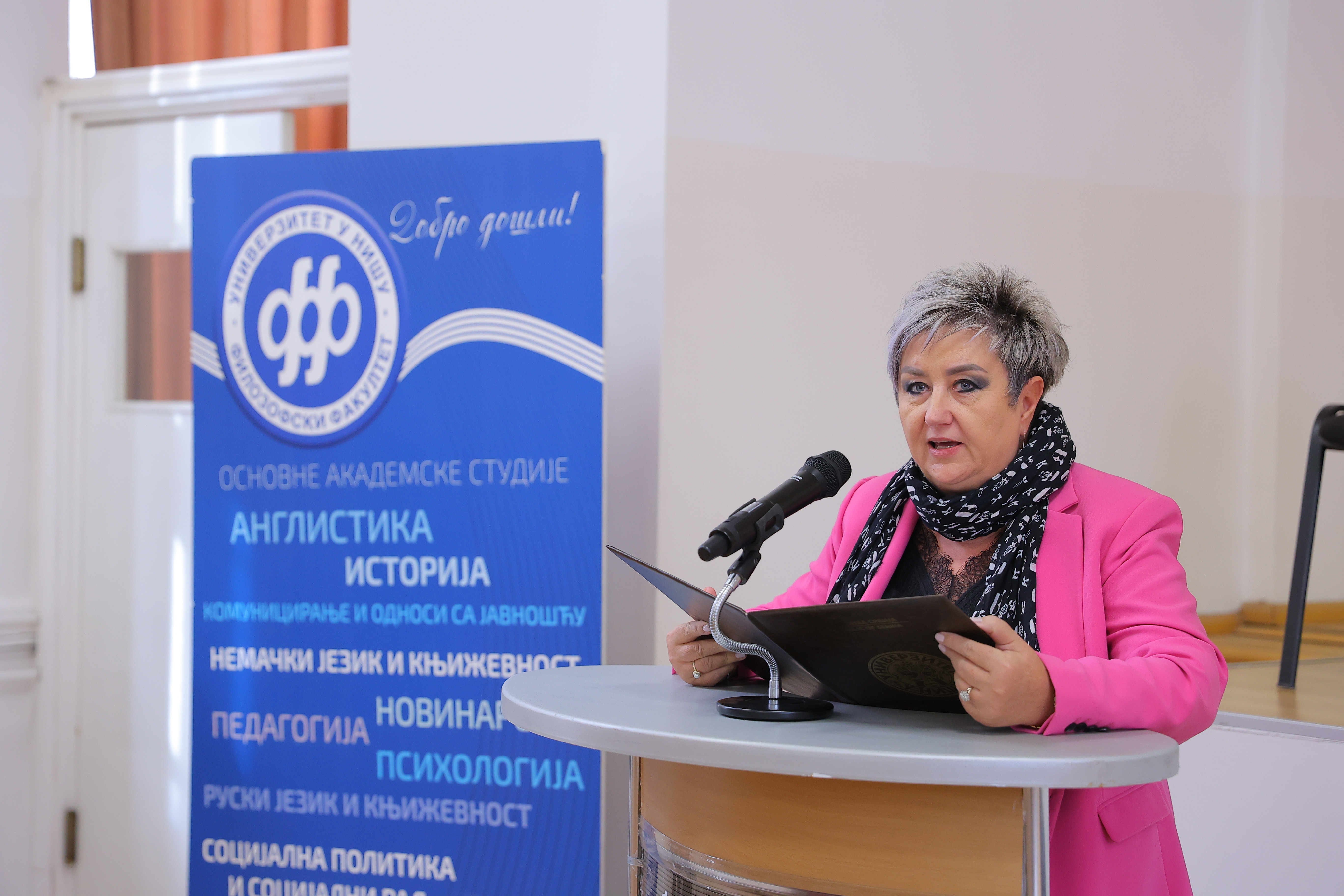 Присутне је прво поздравила декница, проф. др Наталија Јовановић, која је подсетила на значај Филозофског факултета у сфери науке, образовања и културе и додала да се највећи број студената нишког Универзитета већ годинама уназад одлучује за Филозофски факултет. Истакла је да је Факултет универзитет у малом јер нуди највећи број студијских програма на Универзитету у Нишу, као и да студенти нису само број јер им се пружа подршка током студирања и организују бројне активности како би се додатно унапредили.
