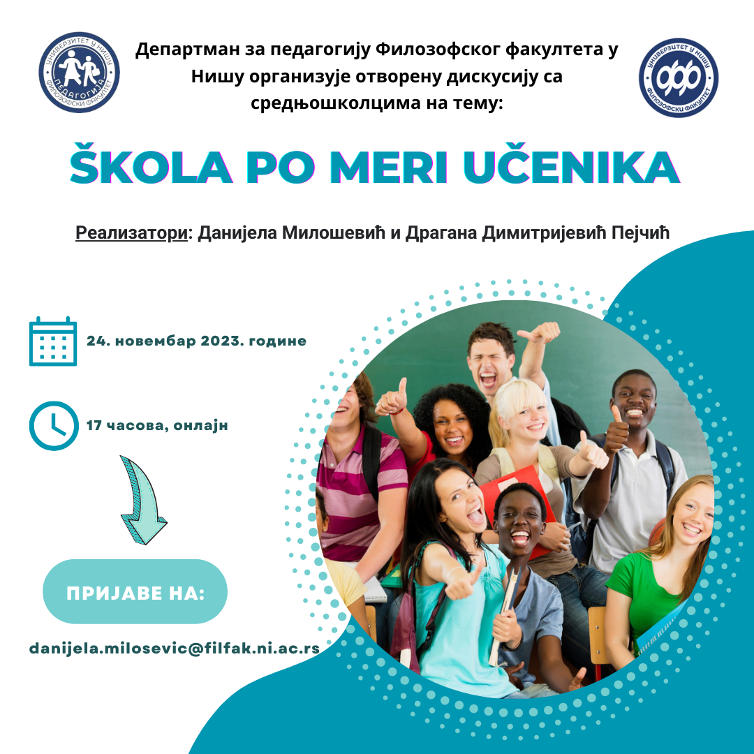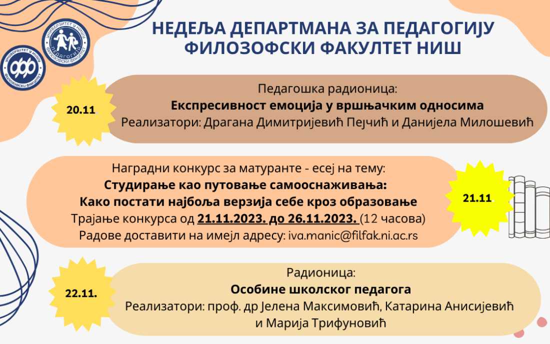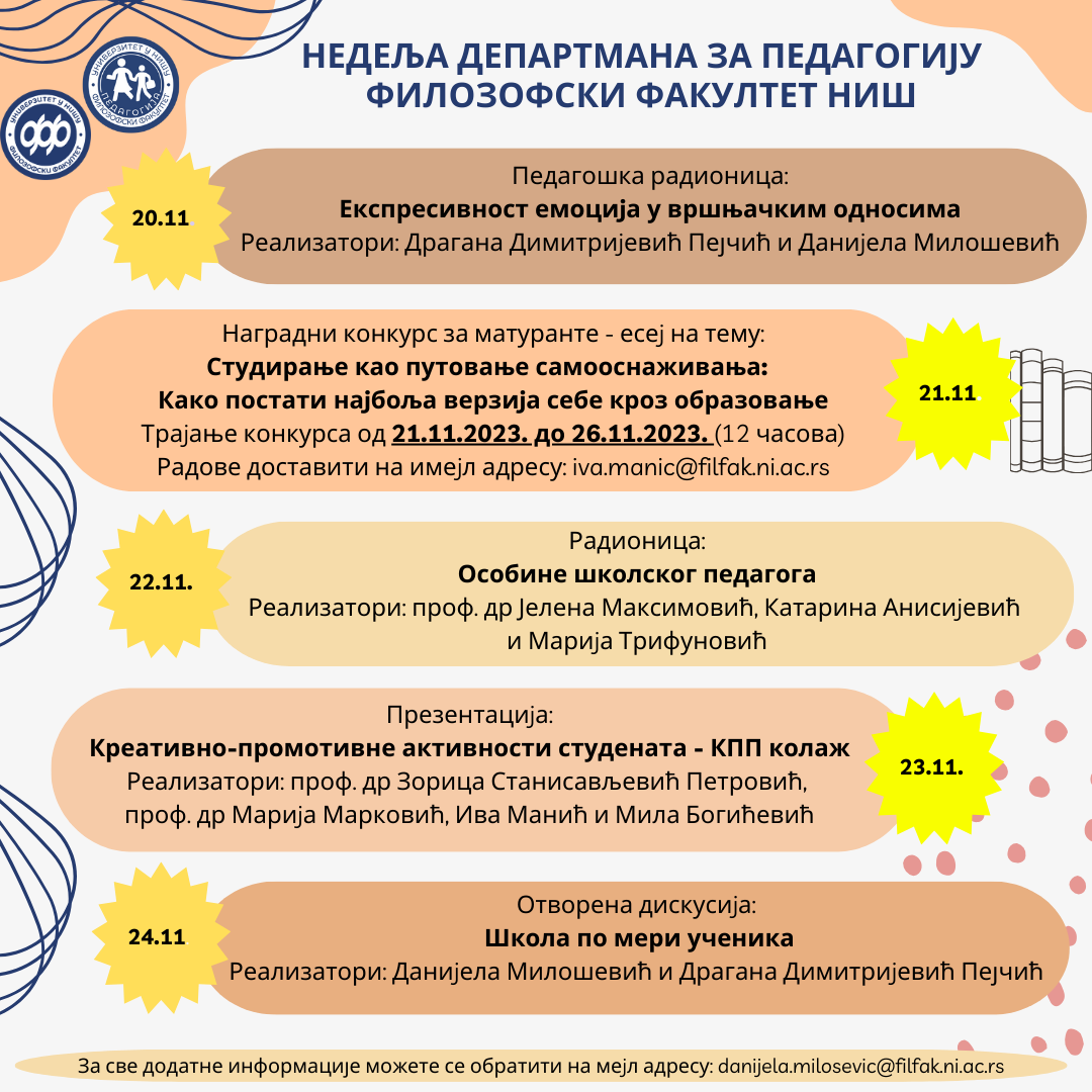 Департман за педагогију Филозофског факултета у Нишу позива заинтересоване ученике да учествују у активностима поводом обележавања Недељe Департмана за педагогију од 20. до 26. новембра 2023. године.