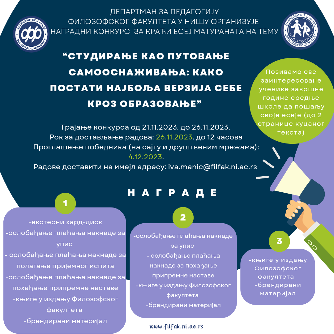 Уторак, 21.11.2023. године биће отворен наградни конкурс за средњошколце за достављање есеја на тему Студирање као путовање самооснаживања: Како постати најбоља верзија себе кроз образовање. Позивамо све матуранте да учествују у писању кратког есеја (до две стране текста) и искористе прилику да освоје неке од вредних награда. Есеј послати на имејл адресу до 26.11.2023. године до 12 часова. У пропратном тексту је потребно навести име и презиме, место и назив школе.