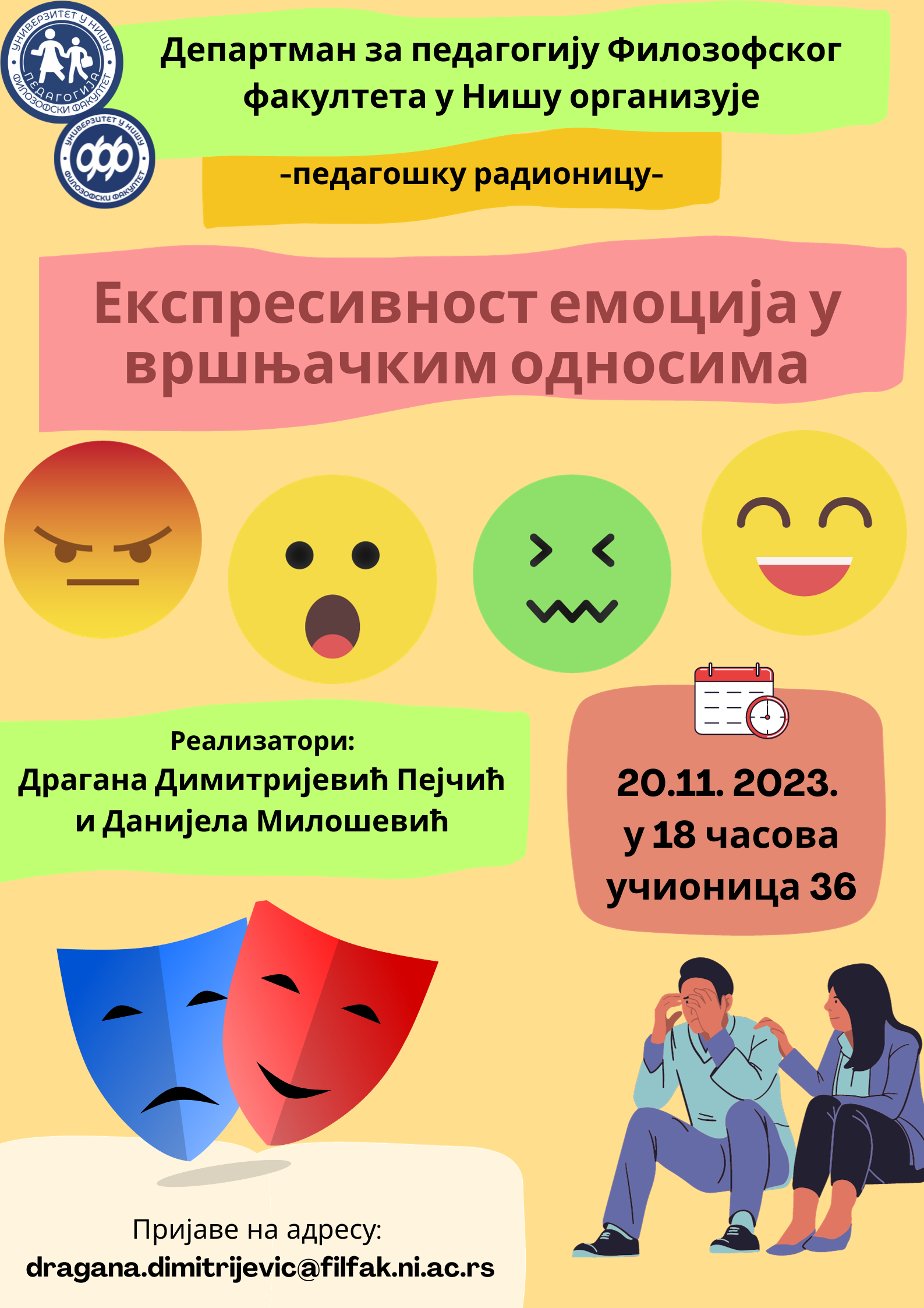 Понедељак, 20.11.2023. године у 18 часова у учионици 36 реализоваће се педагошка радионица Експресивност емоција у вршњачким односима.