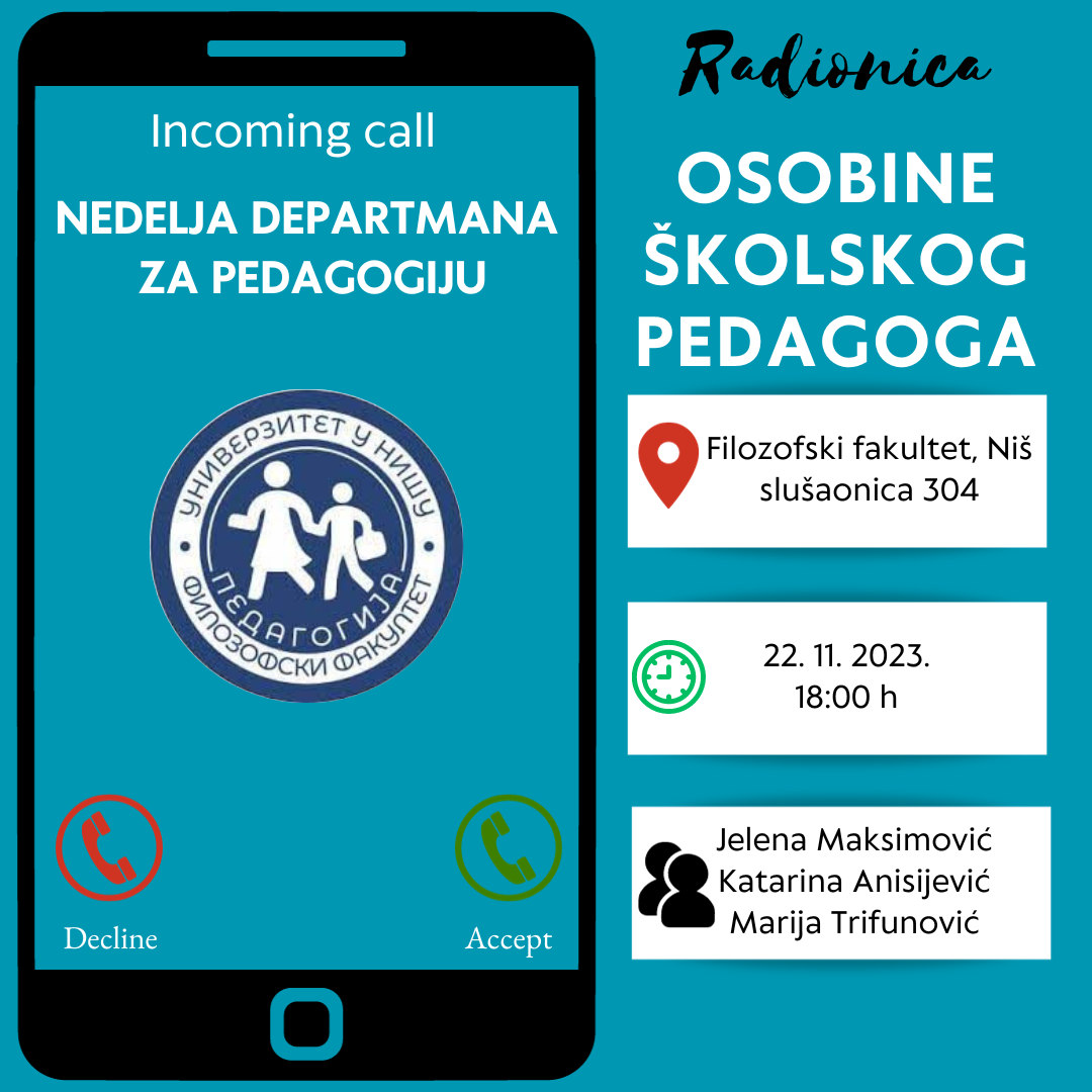 Среда, 22.11.2023. године са почетком у 18 часова у учионици 304 реализоваће се педагошка радионица на тему Особине школског педагога.