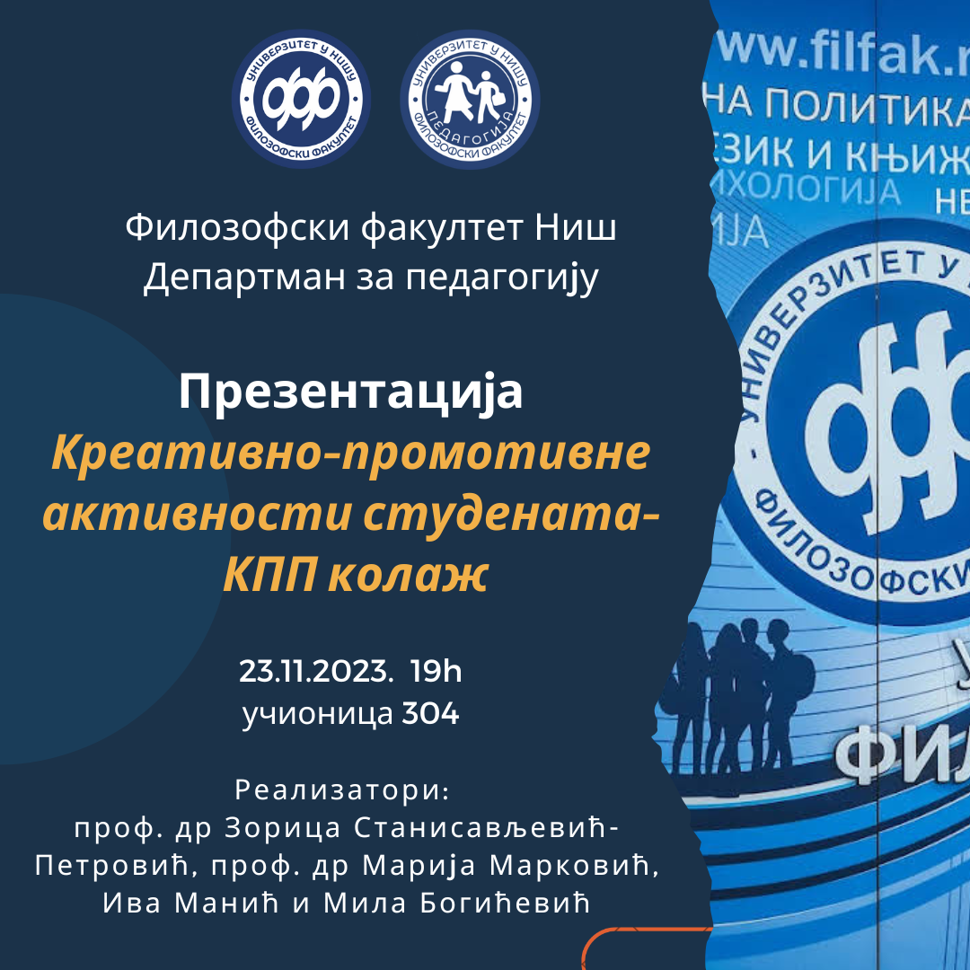 Четвртак, 23.11.2023. године у 19 часова у учионици 304 реализоваће се презентација на тему Креативно-промотивне активности студената - КПП колаж