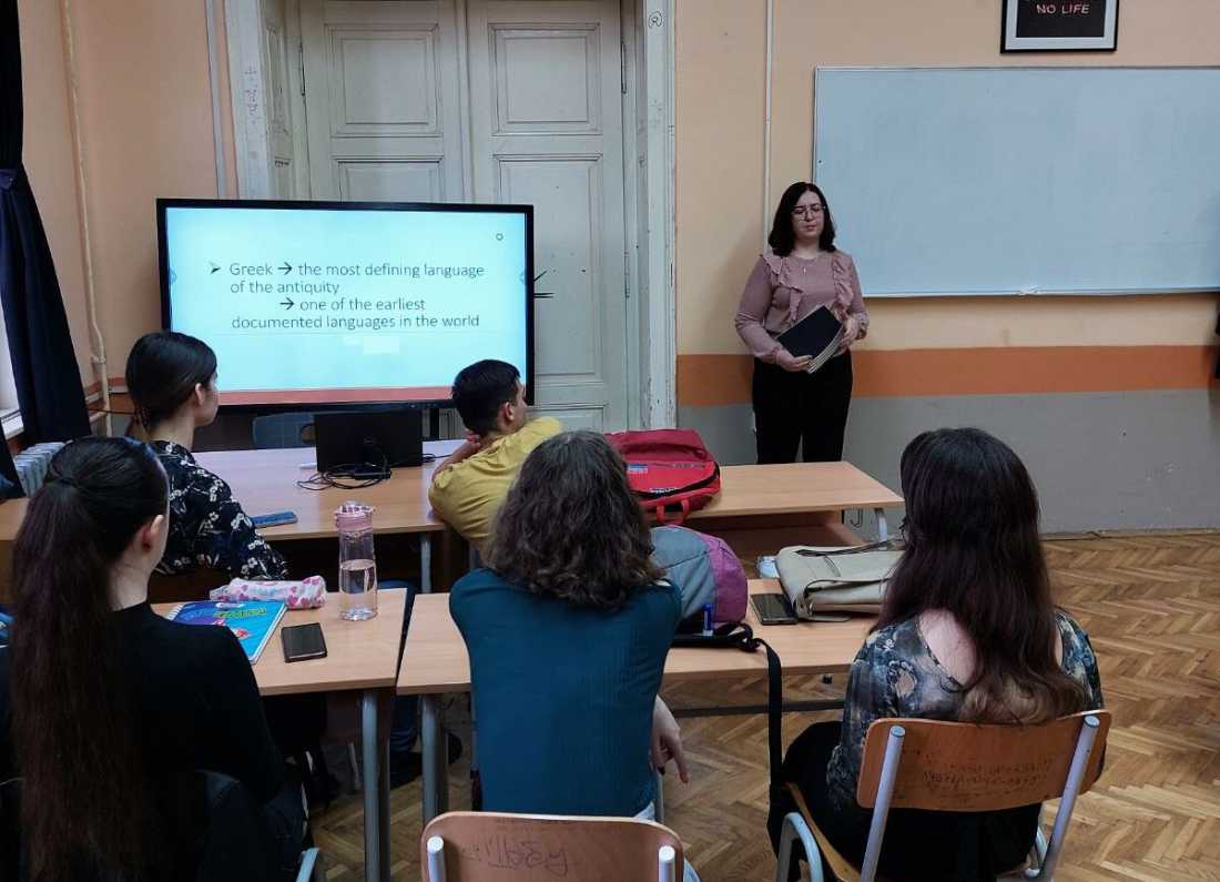 Међународни дан грчког језика обележен је, у организацији Лектората за грчки језик и Центра за стране језике Филозофског факултета, у филолошком одељењу четвртог разреда Прве нишке гимназије "Стеван Сремац" радионицом "Грчко-енглеске језичке везе". Радионицу је креирала и одржала Наталија Пахноглу, студенткиња треће године Англистике. Ученици су показали изузетно интересовање и пратили са великом пажњом. У наставку догађаја ученицима се обратио проф. др Владимир Јовановић са Департмана за англистику и у врло надахнутом излагању предочио младим филолозима пет разлога због којих су студије англистике привилегија.