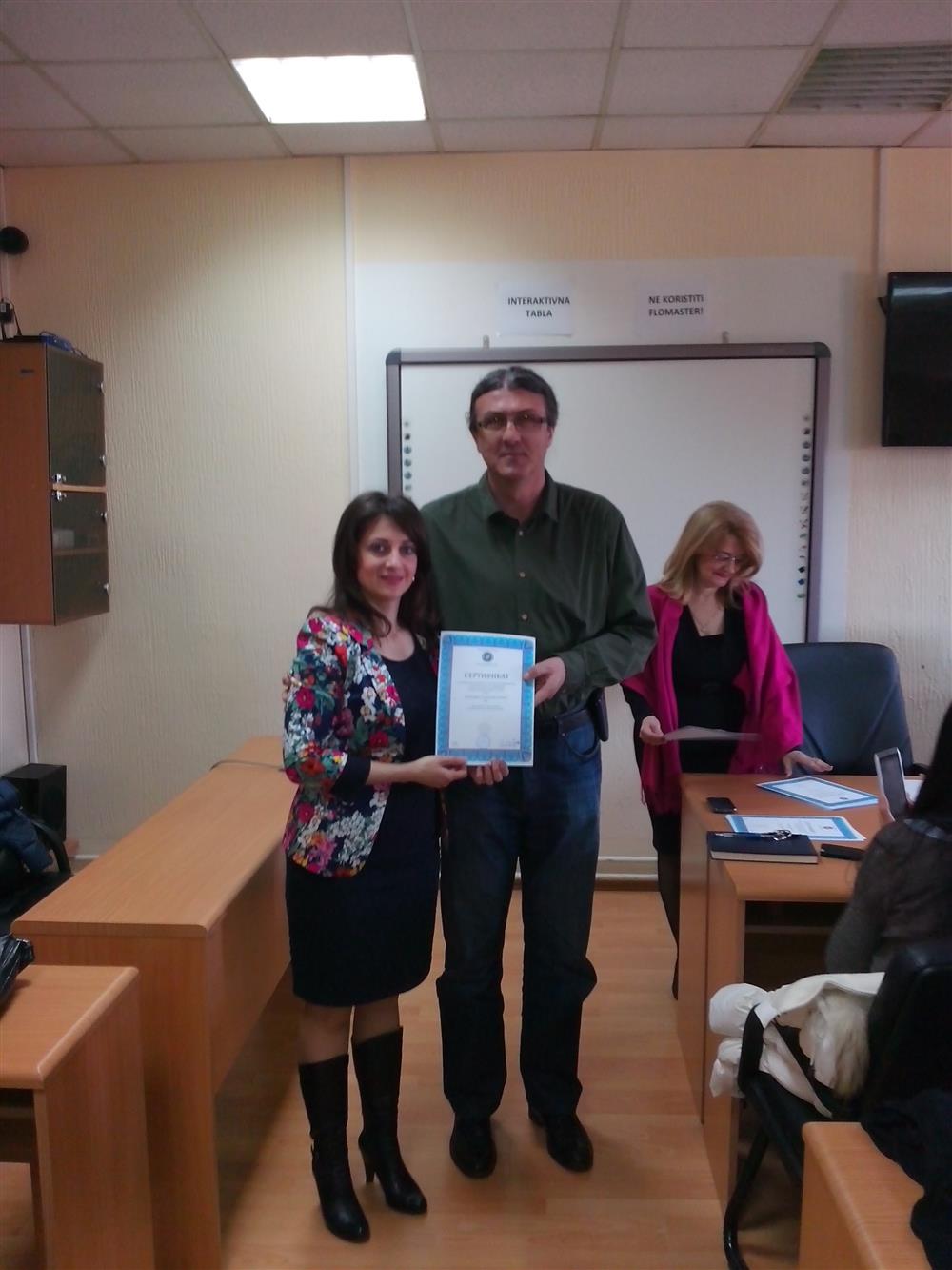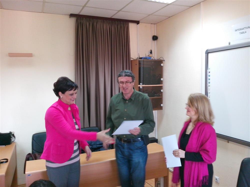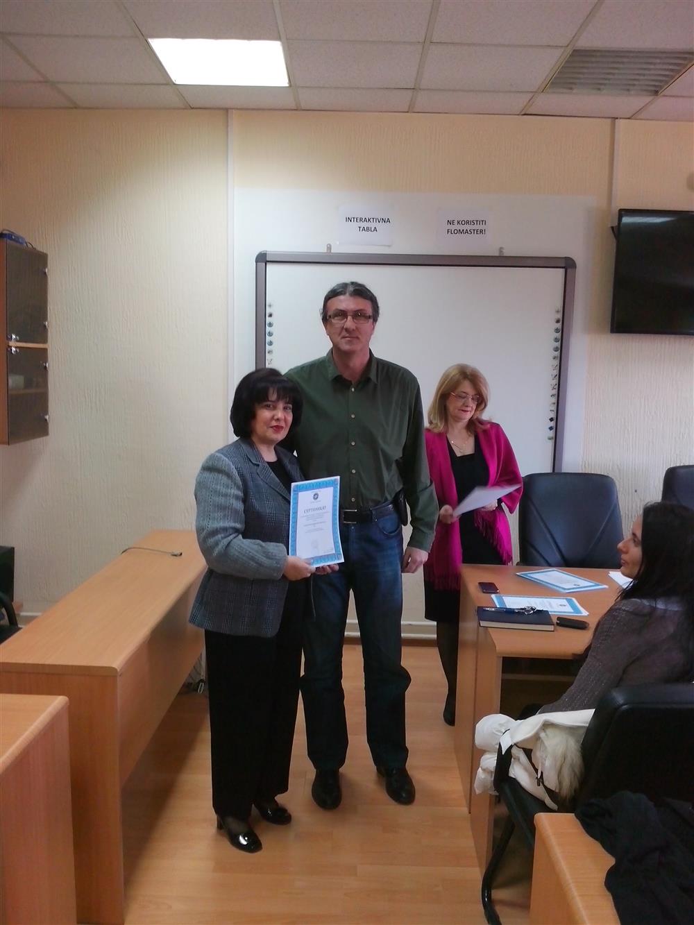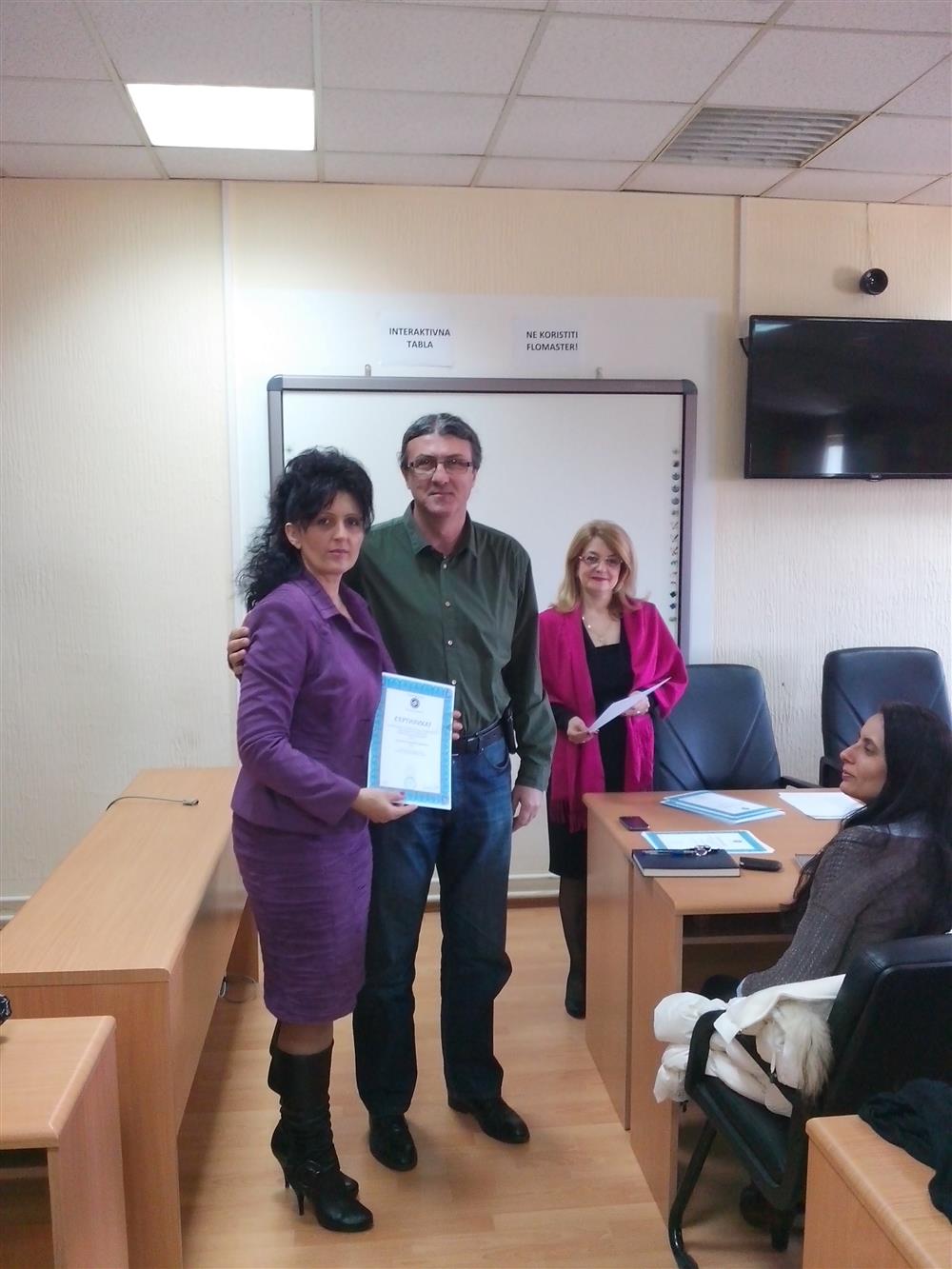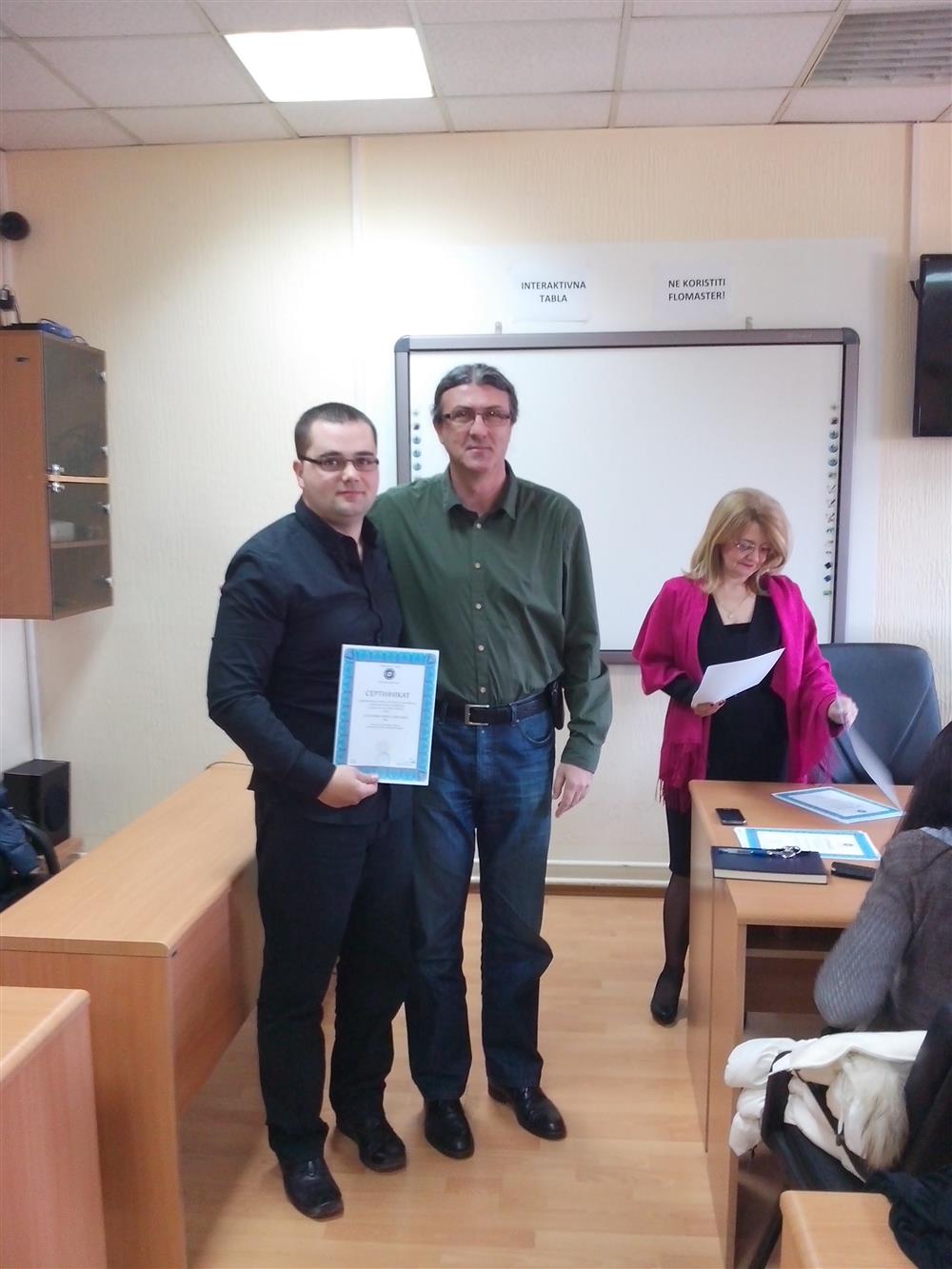 У суботу (4. априла), декан Филозофског факултета, проф. др Горан Максимовић, заједно са колегиницама из Центра за образовање наставника (проф. др Марина Јањић, доц. др Јелена Максимовић и доц. др Гордана Ђигић), доделио је сертификате за успешно завршен семинар за менторску обуку наставника, који је реализован на Филозофском факултету у Нишу у току зимског семестра школске 2014-15. године.