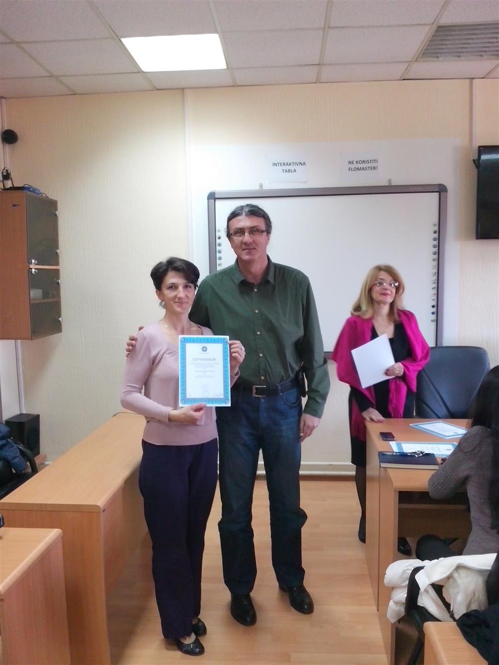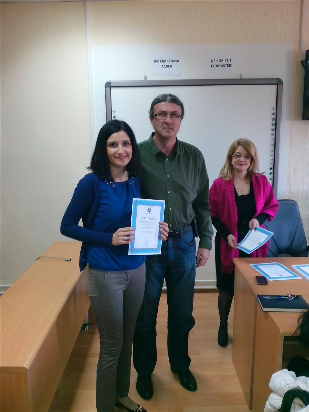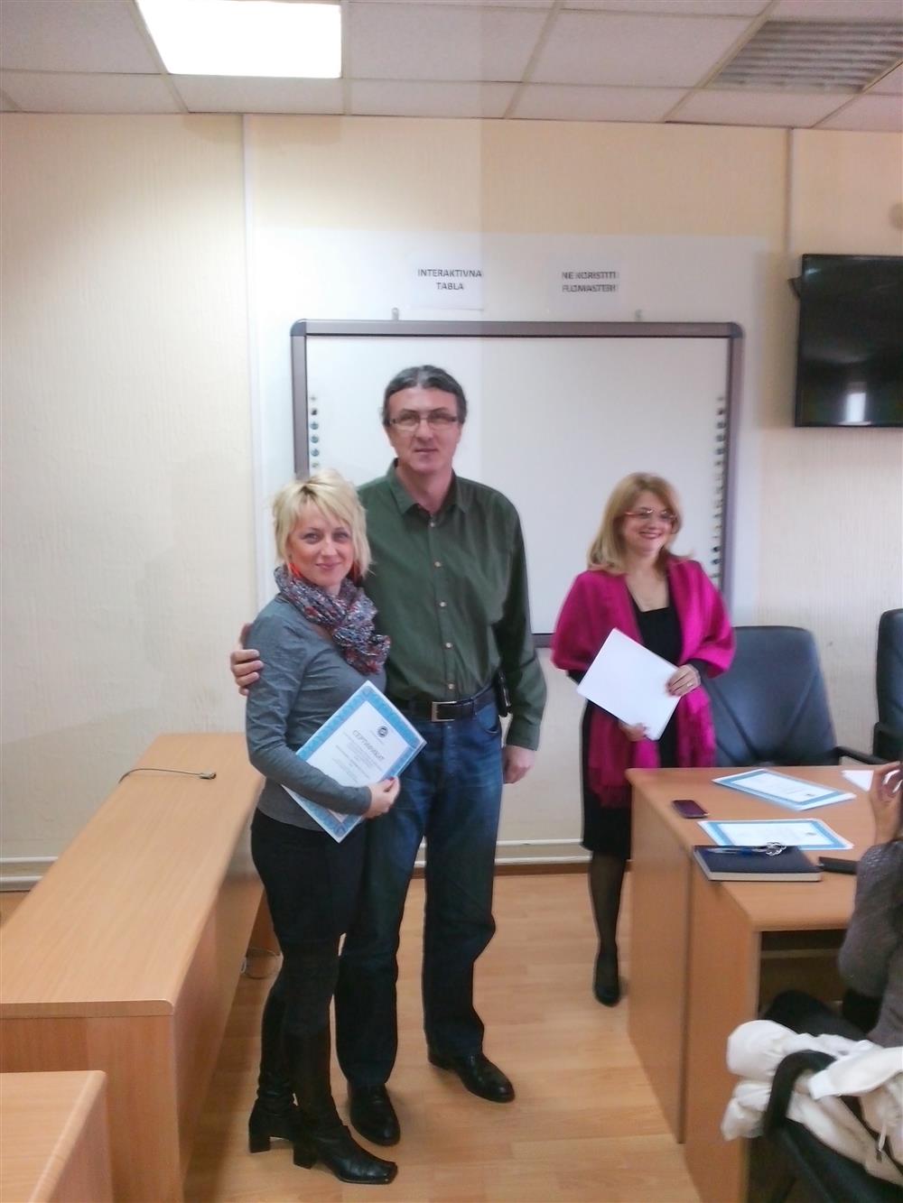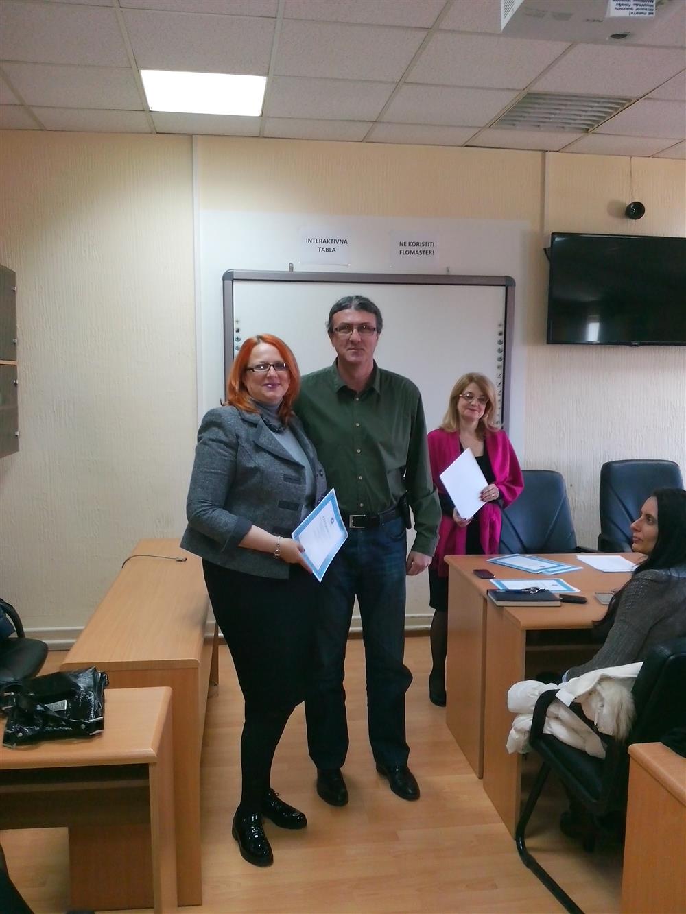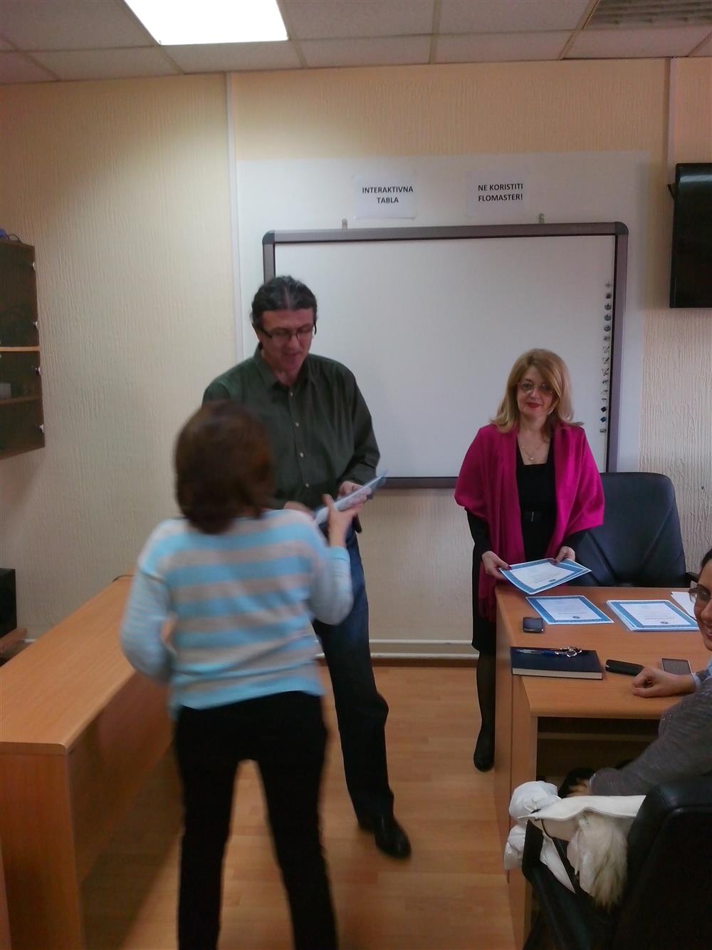 У суботу (4. априла), декан Филозофског факултета, проф. др Горан Максимовић, заједно са колегиницама из Центра за образовање наставника (проф. др Марина Јањић, доц. др Јелена Максимовић и доц. др Гордана Ђигић), доделио је сертификате за успешно завршен семинар за менторску обуку наставника, који је реализован на Филозофском факултету у Нишу у току зимског семестра школске 2014-15. године.