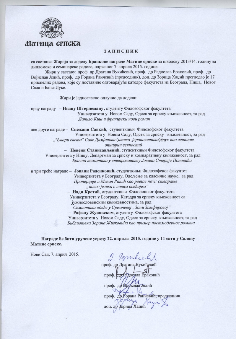 У уторак (7. априла), на састанку Жирија за доделу Бранкове награде Матице српске за школску 2013/14. годину, донета је једногласна одлука да студенткиња СРБИСТИКЕ на Филозофском факултету Универзитета у Нишу, Невена Станисављевић, добије ДРУГУ БРАНКОВУ НАГРАДУ за рад Брачна тематика у стваралаштву Јована Стерије Поповића.