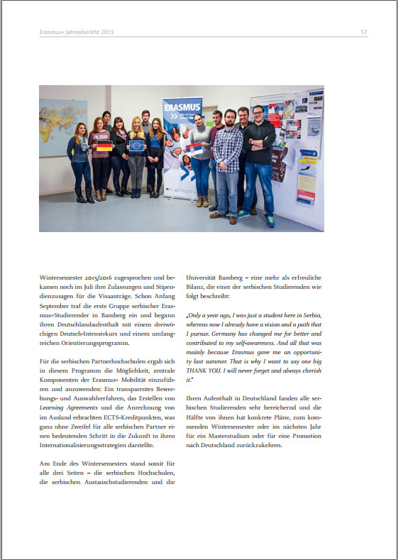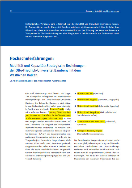Програм мобилности студената у оквиру ширег програма Еразмус плус, на основу кога је више студената Филозофског факултета у Нишу и студената других факултета универзитета у Србији боравило један семестар на Универзитету Ото-Фридрих у Бамбергу, у Немачкој (http://www.filfak.ni.ac.rs/vesti/item/388-poseta-univerzitetu-u-bambergu), предсатвљен је као пример најбоље праксе у Немачкој у Годишњем извештају Немачке службе за академску размену (Deutscher Akademischer Austauschdienst - Erasmus+ Jahresbericht 2015; https://imperia.daad.com/medien/eu/publikationen/erasmus+_jahresbericht_2015.pdf).