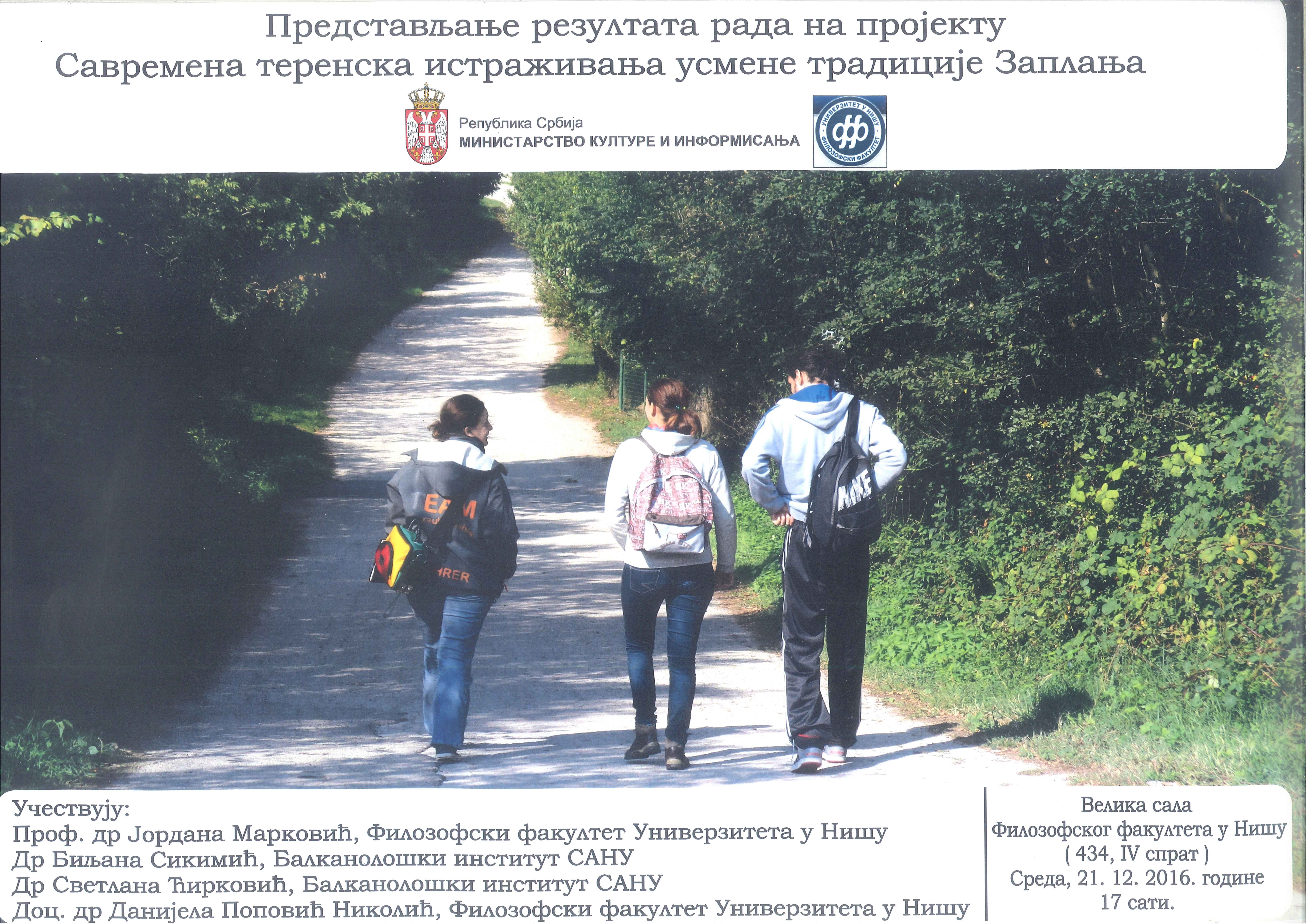 Министарство културе Републике Србије, на основу одлуке Комисије за избор пројеката у области истраживања, заштите и коришћења нематеријалног културног наслеђа, одобрило је и финансијски подржало пројекат Савремена теренска истраживања усмене традиције Заплања Филозофског факултета Универзитета у Нишу. Истраживања усменог наслеђа на територији Заплања реализовао је тим који чине студенти ОАС Србистика и ДАС Филологија, истраживачи са Департмана за српску и компаративну књижевност, Департмана за српски језик, Балканолошкиг института САНУ, Филозофског факултета у Новом Саду, УНиверзитета Ворик и Универзитета Рединг (Велика Британија).
