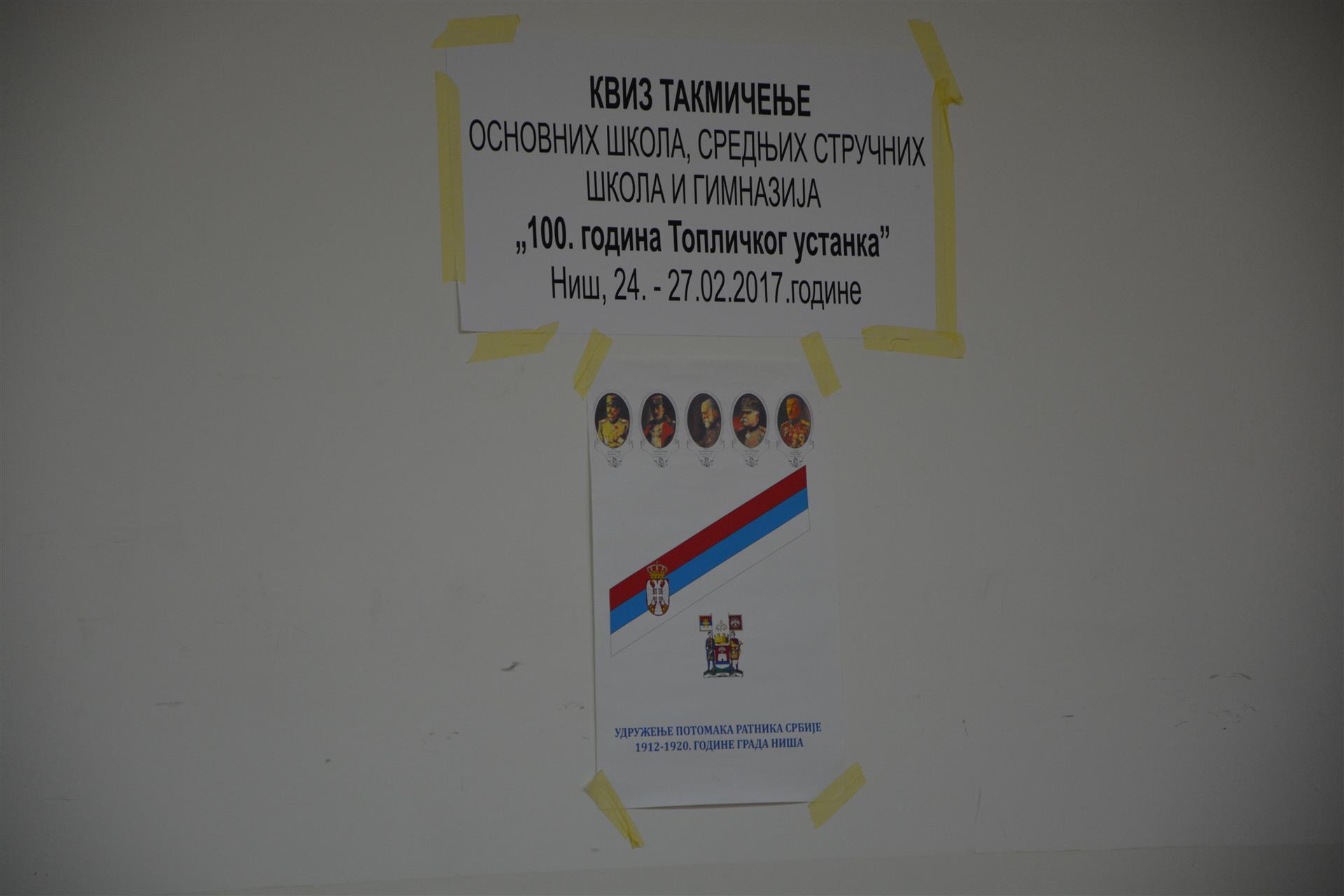 Поводом обележавања 100 година од Топличког устанка одржано је квиз такмичење ученика основних и средњих школа на тему значајног историјског јубилеја. Такмичење је организовало Удружење потомака ратника Србије 1912-1920. године како би се што већи број младих едуковао о овом догађају, а домаћин је био Филозофски факултет у Нишу.