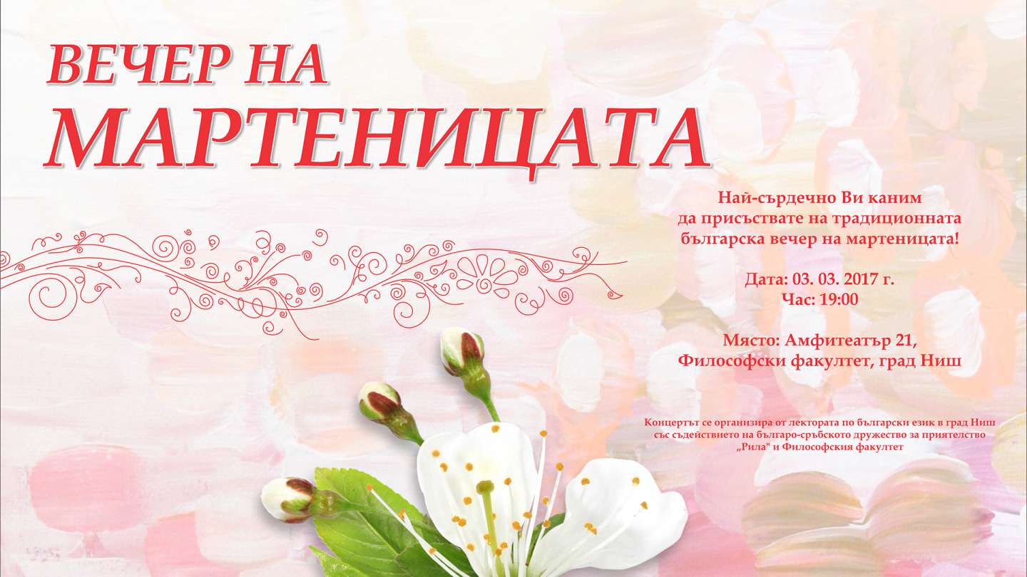 На Филозофском факултету у Нишу 3. марта 2017. године биће одржано традиционално бугарско вече посвећено мартеницама, које организује лекторат за бугарски језик.