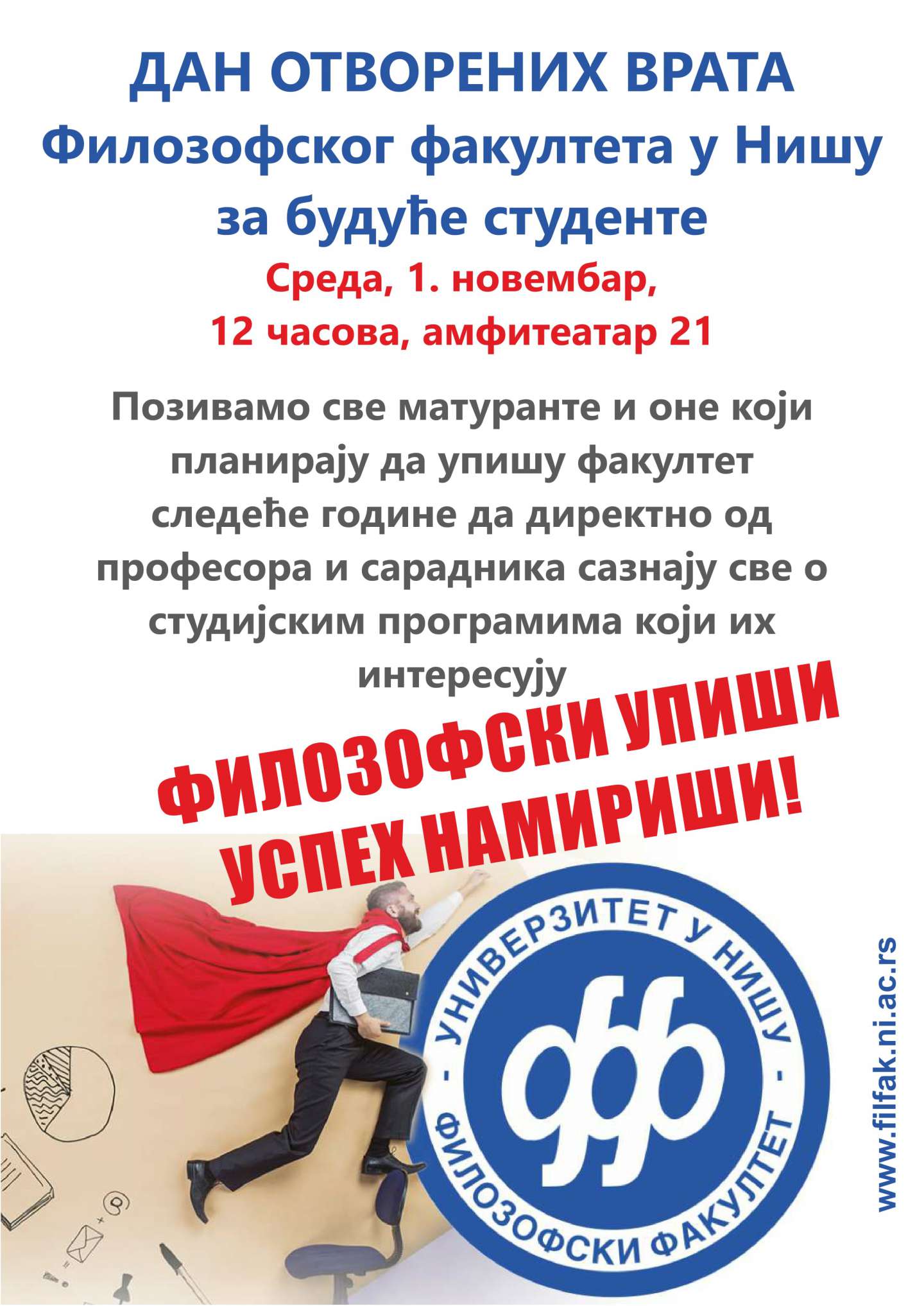 Позивамо вас на први Дан отворених врата у овој школској години који ће на Филозофском факултету у Нишу бити организован у среду, 1. новембра у 12 сати у амфитеатру у приземљу.