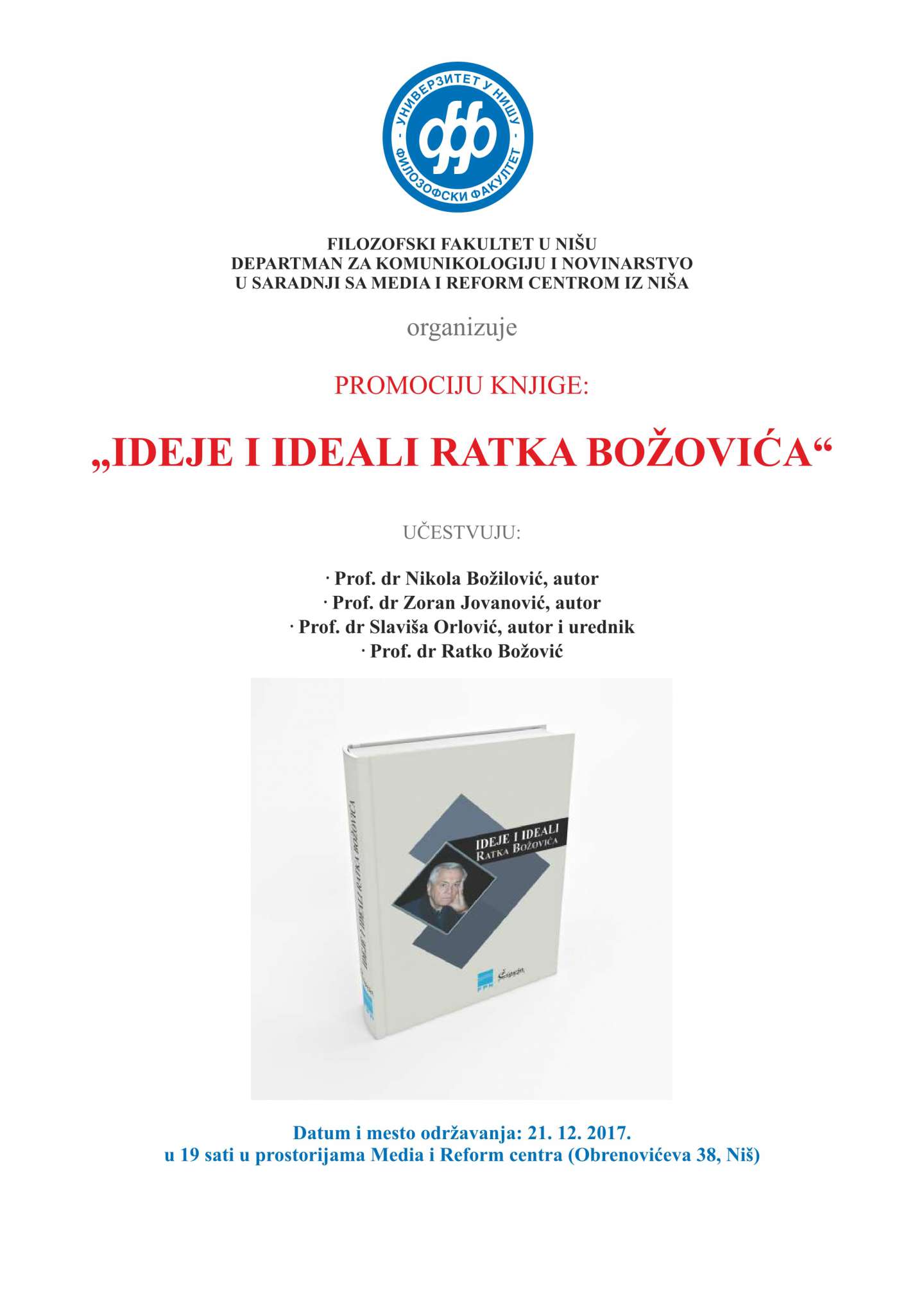 Департман за комуникологију и новинарство Филозофског факултета у Нишу у сарадњи са Медиа и Реформ центром из Ниша организује промоцију књиге "Идеје и идеали Ратка Божовића".
