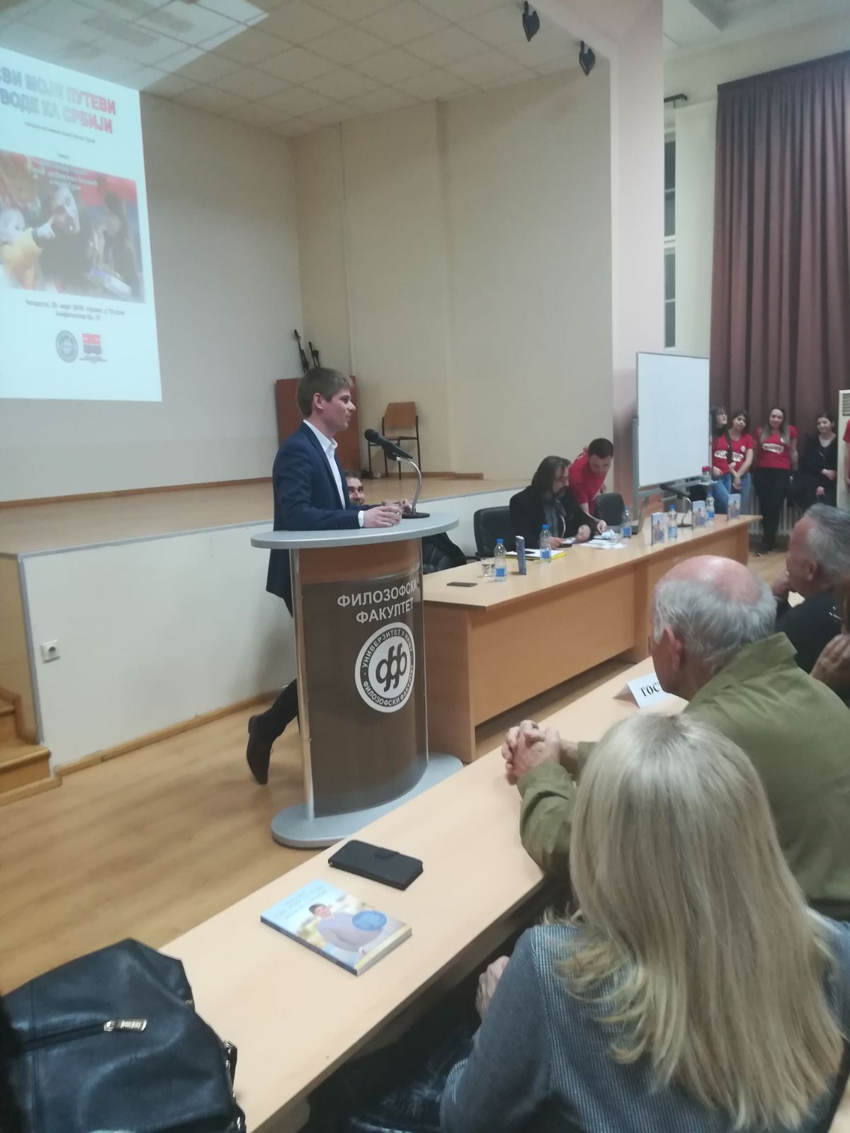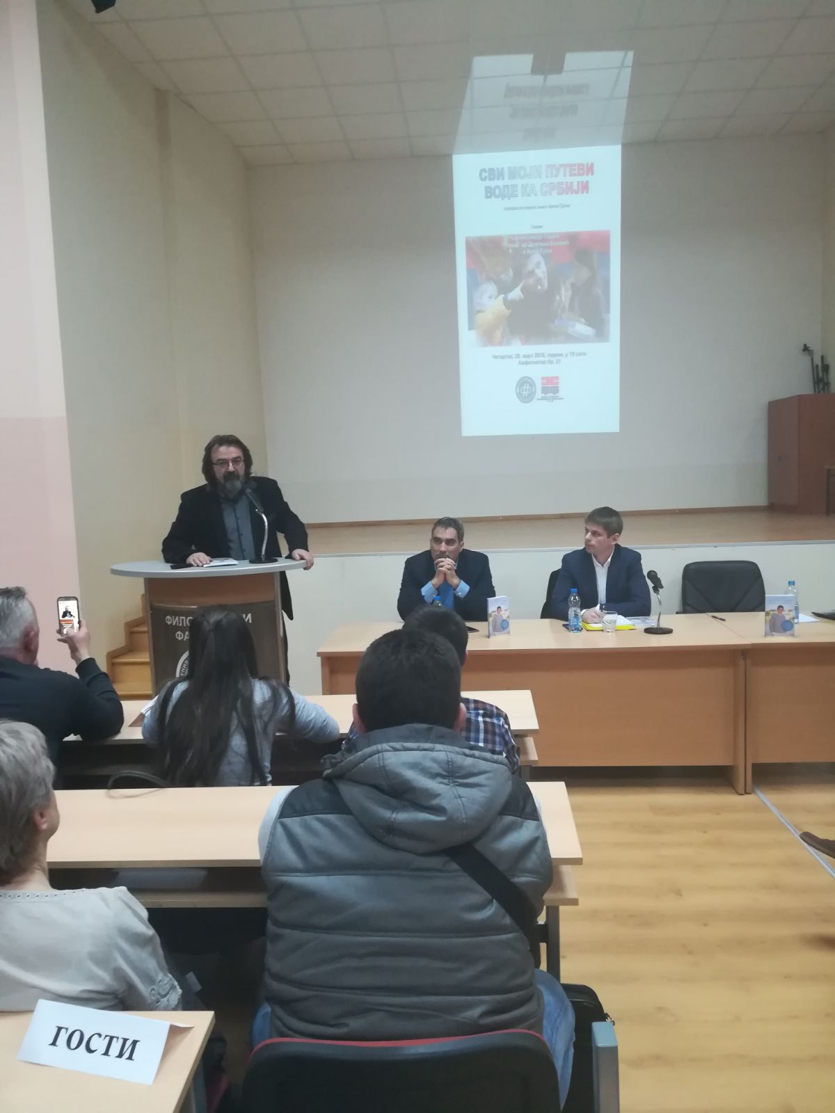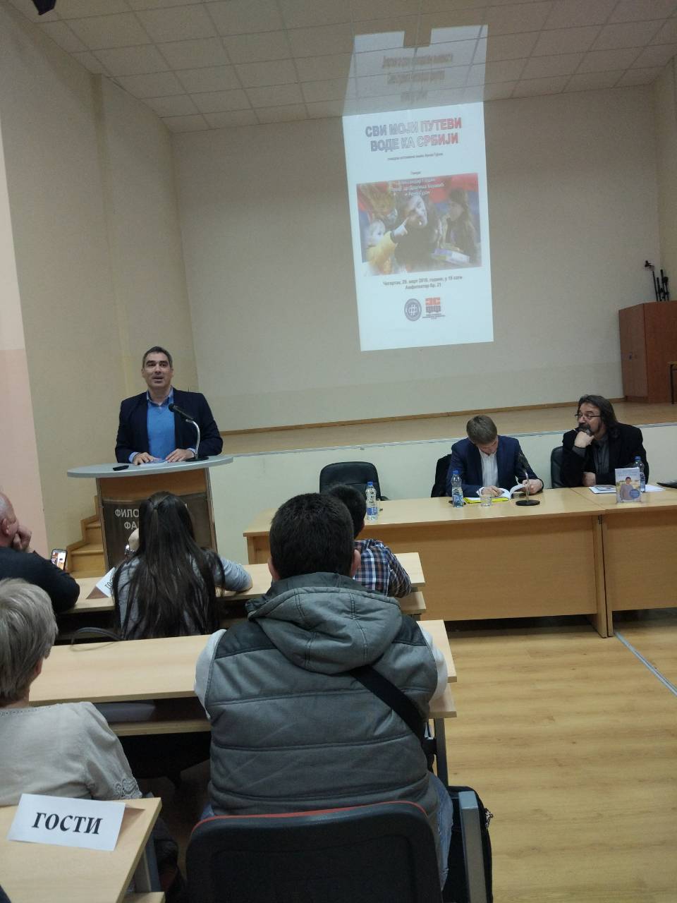 У четвртак, 29. марта, Филозофски факултет је имао част да угости великог хуманитарца и пријатеља српског народа, Арноа Гујона. Том приликом је гост представио своју нову књигу „Сви моји путеви воде ка Србији“ студентима Филозофског факултета и Нишлијама, које су показале велико интересовање за овај догађај.