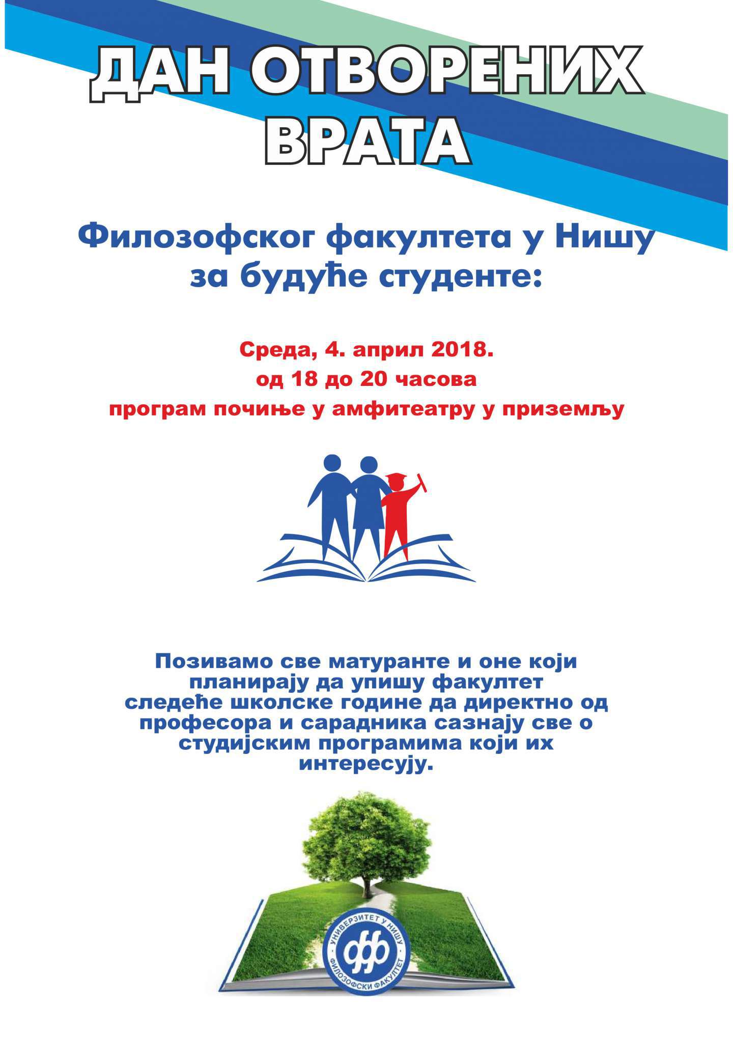 Као што, вероватно, већ знате у среду, 4. априла, организујемо Дан отворених врата. Програм почиње у 18 сати у амфитеатру у приземљу, након чега ће вас представници сваког студијског програма сачекати у одређеним слушаоницама.